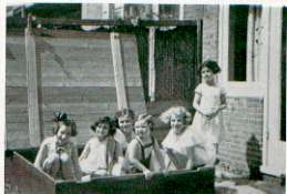 con le sue amiche, nel giorno del suo decimo compleanno. Da sinistra a destra si vedono: Lucie van Dijk, Anna Frank, Suzanne Ledermann, Hanneli Goslar , Juultje Ketellapper, Kitty Egyedi, Mary Bos, Rie (Ietje)Swillens e Marthe van den Berg. Su retro della foto Anna scrisse queste parole per Hanneli Goslar: Festa di compleanno di Anna Frank, 12 - 6 - 1939. |