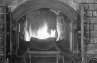 Imboccatura di un forno crematorio. La fiamma l'ha attizzata il fotografo, ma il significato di questa immagine è ugualmente agghiacciante e non ha bisogno di altri commenti. |