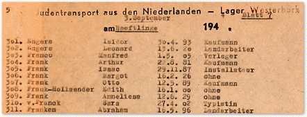 DOPO L'ARRESTO L'ELENCO NAZISTA DEL TRANSPORT IN CUI VIENE INCLUSA LA FAMIGLIA FRANK