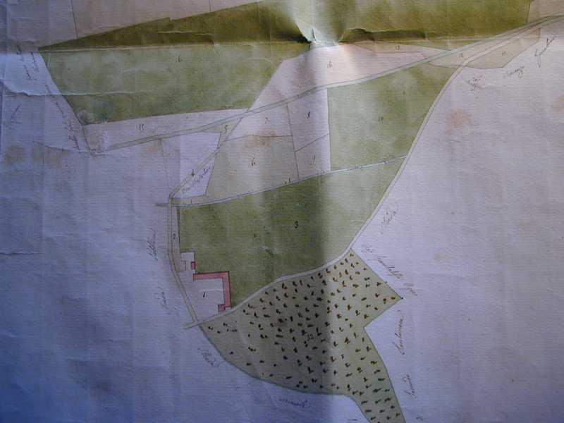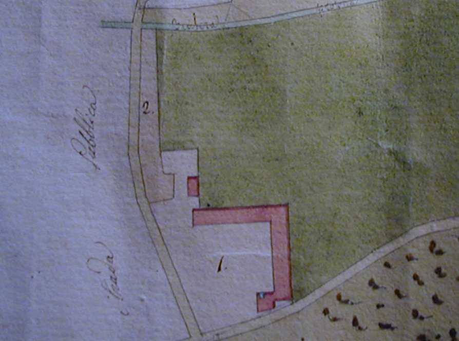 Dal cortile si raggiunge la soglia di pietra rotta in due parti con due gradini in cotto in mediocre stato. La scala è divisa in tre rampe, cioè dal pianerottolo d'entrata si discende al piccolo sottoscala servente da cantina passando per uscio a due battenti di legno dolce senza ordigni di chiusura, in mediocre stato e contando quattro gradini due in pietra e due in cotto in mediocre stato. Dallo stesso pianerottolo si ascende al pianerottolo superiore con due altre rampe avente 9 gradini in pietra per ciascuna in buono stato. Il pavimento del pianerottolo è parte in cotto parte in terrone in meno che mediocre stato. Le pareti che costituiscono la gabbia della scala sono mediocremente arricciate, ma senza tinta. La finestra che dal pianerottolo superiore prospetta nell'aia ha davanzale in pietra, telaio e chiassili (telaio in legno inserito nel vano della finestra per reggere il serramento) di legno forte senza vetri, scuretti esterni in legno dolce il tutto in cattivo stato. 2. Camera al pianterreno a sinistra del pianerottolo L'uscio d'accesso è di legno dolce ad un battente con serratura senza chiave in mediocre stato. Il pavimento è di quadrelle in cotto in meno che mediocre stato, le pareti sono di vecchia arricciature senza tinta e quasi sporche, così dicasi del soffitto a volta. Il camino è senza cappa. La finestra verso aia ha davanzale in pietra, telaio e chiassili in legno forte senza vetri, inferriata, il tutto in mediocre stato, lo scuretto esterno a due battenti in legno dolce è in cattivo stato. 3.Camera attigua a ponente della descritta al n. 2 Si accede per uscio in legno dolce ad un battente senza ordigni di chiusura in mediocre stato, pavimento parte in quadrelle e parte in mattoni in pessimo stato. Soffitto a volta e pareti senza tinta e di antica arricciatura. Due finestre, una verso cortile, l'altra a ponente con davanzali in pietra, inferriate, telaio e chiassili di legno forte senza vetri; scuretti esterni a due battenti di legno dolce il tutto in mediocre stato. 4. Cucina al pianterreno a destra del pianerottolo L'uscio d'ingresso è di legno dolce ad un battente con serratura senza chiave in mediocre stato. Il pavimento di quadrelle è in pessimo stato; il soffitto a volta e le pareti di vecchia e logora arricciatura sono senza tinta e quasi annerite. Il camino con scarsa cappa è in cattivo stato; l'acquaio nell'angolo nord ovest della cucina in cotto è in buono stato. L'armadio nell'angolo nord est a tre piani il tavolato in legno è in cattivo stato. Le due finestre verso cortile hanno davanzale in pietra, inferriata, telai e chiassili di legno forte senza vetri in mediocre stato, scuretti a due battenti esterni di legno dolce in cattivo stato. 5. Camerone ad uso granaio soprastante ai vani descritti alli n. 2-3 L'uscio d'entrata del pianerottolo superiore è di legno dolce ad un battente con serratura e chiave in mediocre stato. Il pavimento è di quadrelle in buono stato; il soffitto a volta con arricciatura è rovinato in vari punti con significanti screpolature; le pareti sono arricciate senza tinta in mediocre stato. Le tre finestre hanno davanzale in pietra, telai e chiassili di legno forte senza vetri in mediocre stato, scuretti esterni a due battenti di legno dolce in cattivo stato. 6. Camera soprastante alla cucina descritta al n. 4 Si accede per uscio di legno dolce ad un battente con serratura e chiave in mediocre stato. Il pavimento è di quadrelle in buono stato. Il soffitto a volta e le pareti sono arricciate mediocremente senza tinta. Le due finestre a giorno hanno telai, chiassili di legno forte senza vetri in mediocre stato, scuretti esterni a due battenti di legno dolce in cattivo stato. Il finestrino a notte ha telaio, chiassili senza vetri di legno forte, scuretto ad un battente di pino, tutto in mediocre stato. 7. Camera a destra della precedente 6, soprastante a tre voltine nuove della stalla descritta in seguito Dalla precedente camera si accede a questa per uscio ad un battente di legno dolce, munito di piccolo catenaccio, il tutto in mediocre stato. Il pavimento di quadrelle, le voltine su travi in ferro colle pareti arricciate e senza tinta, il tutto nuovo e di recente costruzione. La finestra verso cortile ha davanzale in pietra, chiassili e telai senza vetri di legno forte, scuretti a due battenti di legno dolce, il tutto in buono stato. 8.Stalla La porta d'entrata che comunica coll'aia è a 2 battenti di legno forte senza ordigni di chiusura, in meno che mediocre stato. La corsia è distinta (?) dalla lettiera mediante cordone in muratura in buon stato, corrente per tutta la lunghezza del locale. Il pavimento della corsia è di mattoni e quadrelle in cattivo stato e manca per 1/5. Il soffitto è costituito da 22 voltine, 19 delle quali di antica costruzione, su travatura di legname irregolare ed in mediocre stato, e tre su travature in ferro e di recente costruzione. Sia le pareti che i volti sono privi di arricciature. Le quattro finestre verso aia di piccola dimensione hanno architrave in legno, inferriata, telai fissi in legno forte con vetri, cinque dei quali mancano in complesso per due di esse, il tutto in mediocre stato. I quattro finestrini verso notte hanno semplicemente il telaio fisso in legno forte con vetri ed ivi si riscontra mancarne due. Il cassone del foraggio è di legno forte in mediocre stato. La mangiatoia è pure di legno forte in più che mediocre stato ed è collegata e sostenuta con allacciamenti di ferro fissi al muro. L'uscio che comunica colla cucina è di pino ad un battente con catenaccio il tutto in mediocre stato. La porta che mette all'esterno nella concimaia è a due battenti di legno forte con spranga interna per chiusura, il tutto in cattivo stato. 9. Concimaia La concimaia è ubicata nell'angolo nord est del fabbricato ed è recentemente costrutta. E' coperta da tre voltine su travature in ferro e non ha alcun pavimento. 10. Fienile Il fienile sovrasta la stalla e la concimaia ed appog