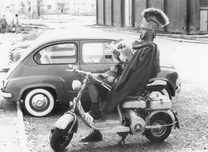 Roma, Cinecittà, 1959. "Antico romano" in Lambretta.