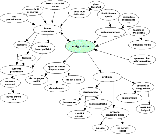 Come potrai osservare, in essa, a partire dal tema che noi abbiamo stabilito come centrale, l'emigrazione, sono rappresentate: le cause generali e particolari del fenomeno (ovvero il boom e la crisi dell'agricoltura, le cui frecce sono dirette verso la parola chiave), le caratteristiche che esso assume e i problemi che comporta (collegati da frecce che si dipartono dalla parola chiave). |